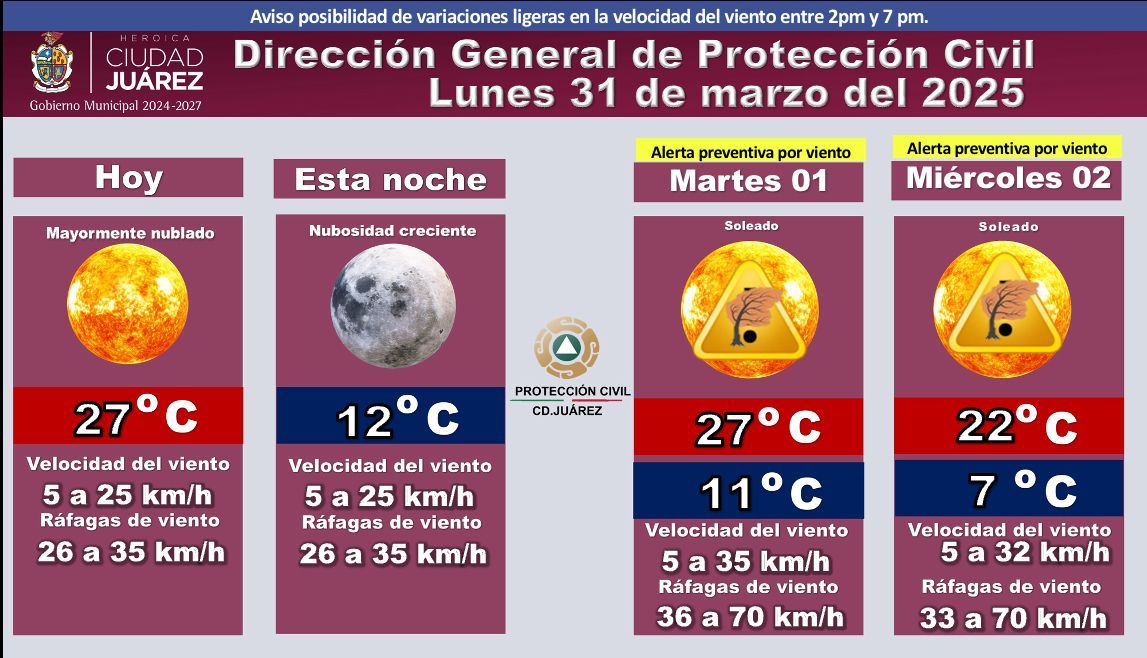 Protección Civil hace un llamado a la ciudadanía a mantenerse informada y tomar precauciones ante las ráfagas de viento, especialmente durante las tardes, ya que se contempla la posibilidad de variaciones en la velocidad del viento entre las 2:00 y las 7:00 de la tarde.