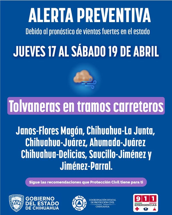 Este sistema traerá rachas superiores a 70 km/h, afectando municipios como Juárez, Ascensión, Nuevo Casas Grandes, Janos, Casas Grandes, Ahumada, Gómez frías, Cuauhtémoc, Chihuahua, Guachochi, Camargo, Delicias, Saucillo, Jiménez y Meoqui.