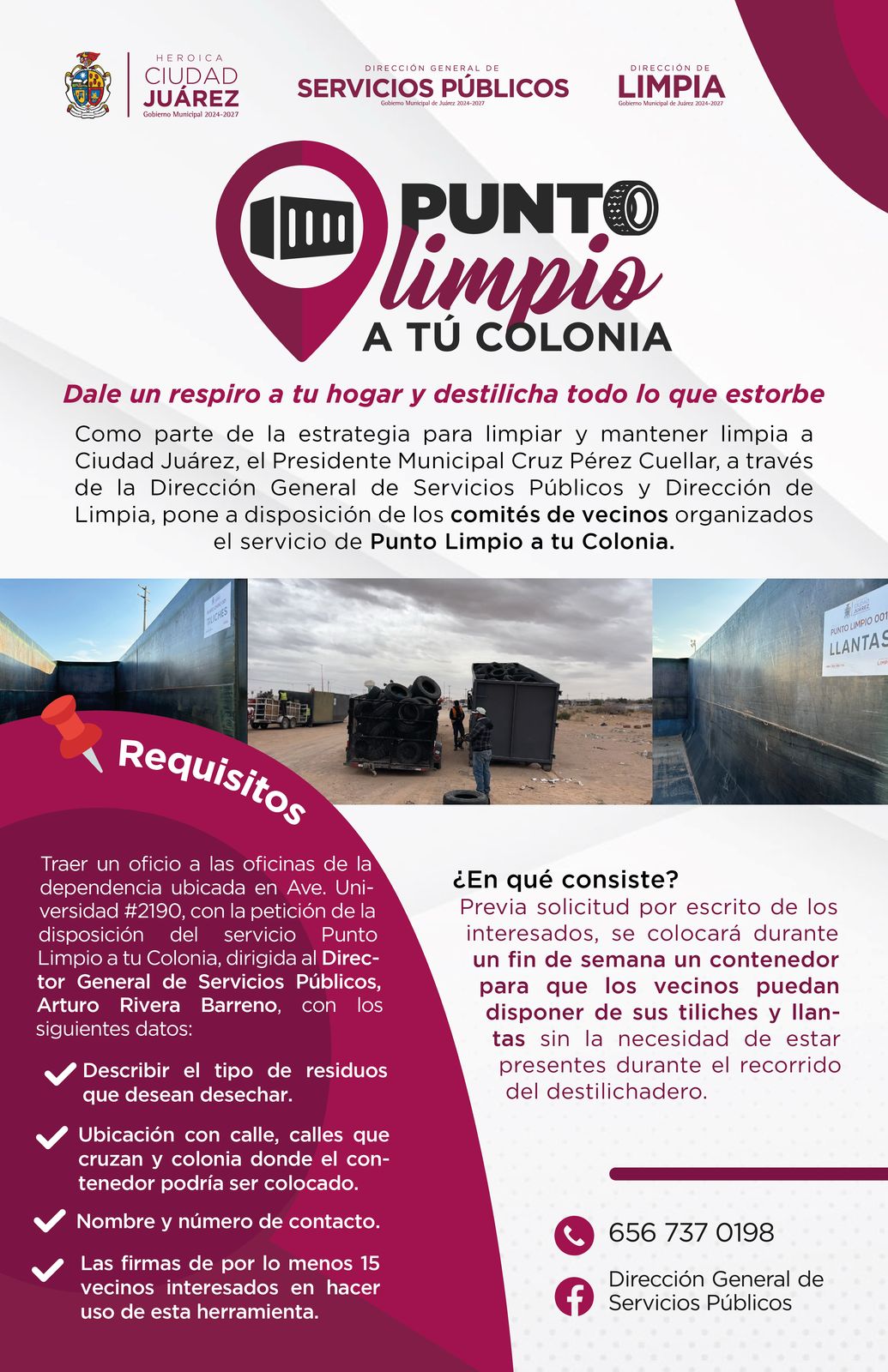 Como parte de la estrategia para limpiar y mantener en buenas condiciones de aseo a Ciudad Juárez, el Presidente Municipal, Cruz Pérez Cuéllar, a través de la Dirección General de Servicios Públicos y la Dirección de Limpia, pone a disposición de los vecinos organizados el servicio “Punto Limpio a tu Colonia”.