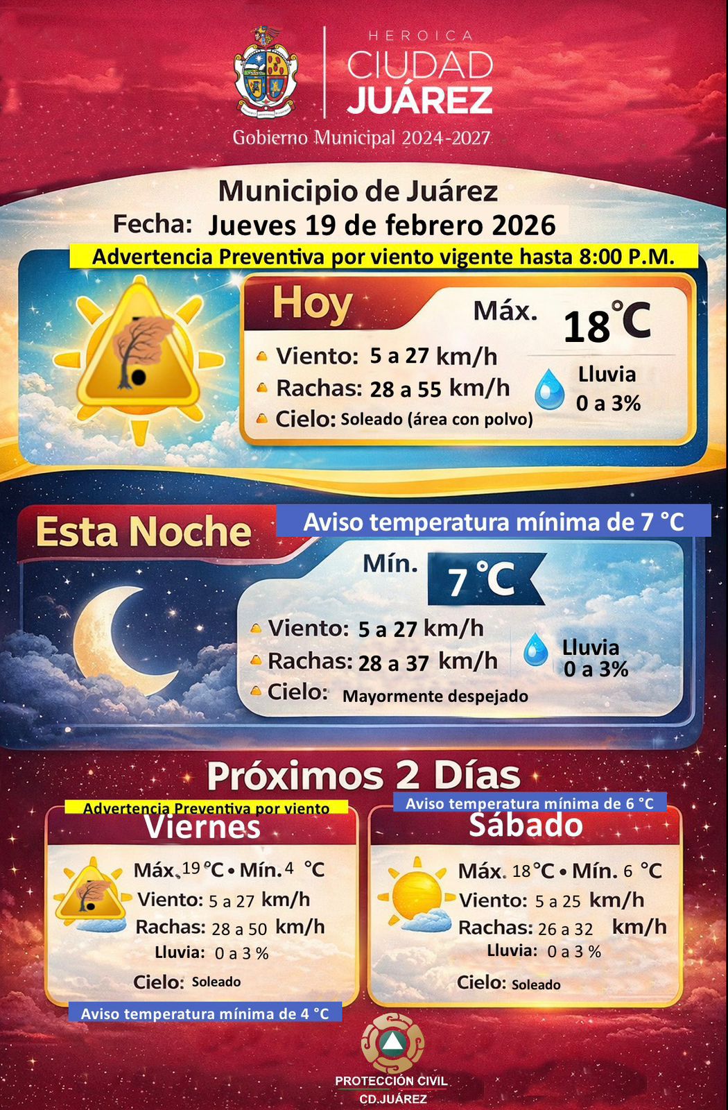 La Dirección General de Protección Civil del Gobierno Municipal, informó que este jueves 19 de febrero se mantiene una advertencia preventiva por viento vigente hasta las 8:00 de la noche.