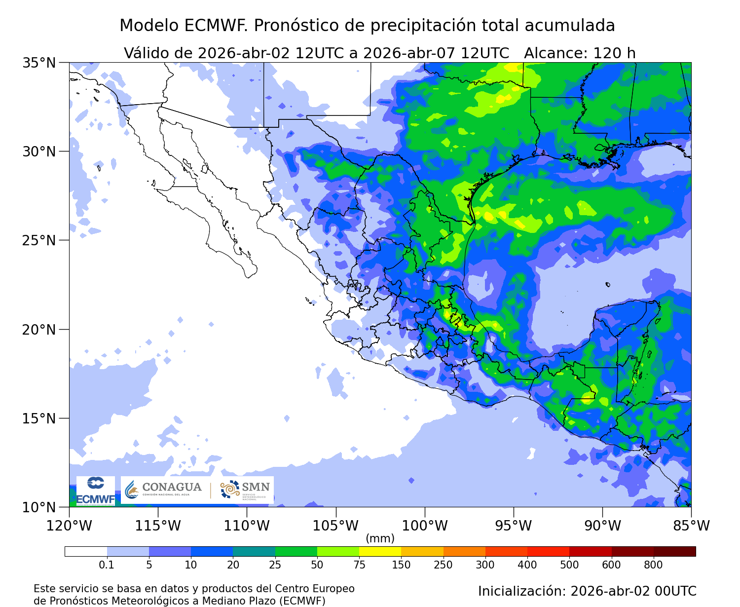 - Intervalos de chubascos (5 a 25 mm): Nuevo León, Tamaulipas, San Luis Potosí, Hidalgo, Estado de México, Tlaxcala, Puebla, Veracruz, Oaxaca, Campeche, Yucatán y Quintana Roo.