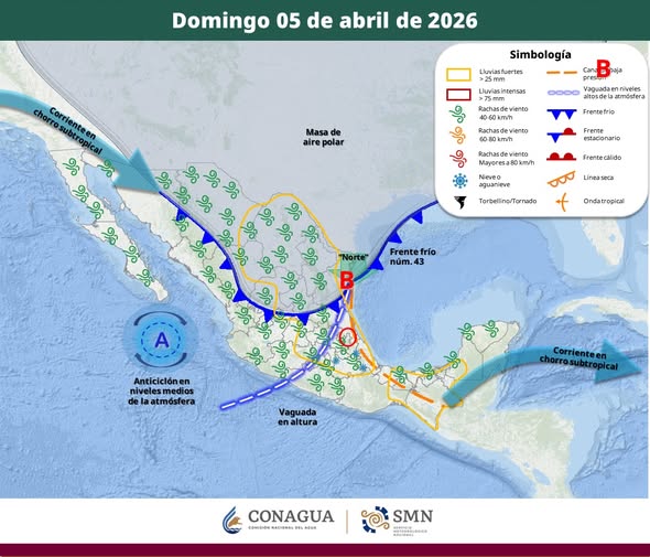 El frente frío núm. 43 y su masa de aire polar se desplazarán sobre el noreste y oriente del territorio nacional, en interacción con un canal de baja presión en el sureste mexicano, una vaguada en altura, la corriente en chorro subtropical e inestabilidad atmosférica, ocasionarán la probabilidad de lluvias fuertes a muy fuertes con descargas eléctricas y caída de granizo en el noreste, oriente y sureste mexicano, incluida la península de Yucatán, con lluvias puntuales intensas en Hidalgo, Puebla y Veracruz; así como chubascos y lluvias fuertes en el norte, occidente y centro del país. A su vez, se prevé evento de “Norte” con rachas de viento de 60 a 80 km/h en Tamaulipas, Veracruz e istmo y golfo de Tehuantepec; además de un nuevo descenso de las temperaturas en el norte, centro y oriente del territorio nacional; además de la probabilidad de nieve o aguanieve en las cimas de los volcanes Popocatépetl, Iztaccíhuatl y Pico de Orizaba.