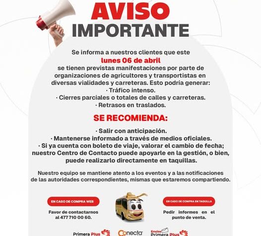 La compañía de transporte Primera Plus, emitió un aviso en su página web para...