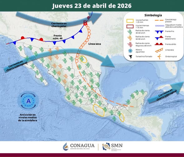 El frente frío núm. 46 se extenderá sobre la frontera noroeste y norte de la República Mexicana, mientras que una línea seca se establecerá en Coahuila, ambos sistemas interaccionarán con la corriente en chorro subtropical generando rachas fuertes de viento en el noroeste y norte del país, así como lluvias fuertes en Coahuila y chubascos en Nuevo León y Tamaulipas.